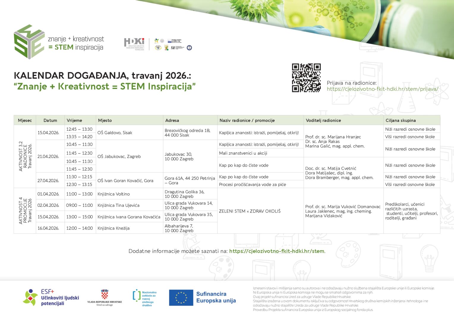 Radionice su namijenjene djeci i mladima u dobi od 2 do 18 godina, dok su promotivne aktivnosti otvorene široj javnosti. Promocije će se provoditi u Zagrebu i Koprivnici, a njihova središnja tema je ZELENI STEM – ZDRAV OKOLIŠ, s ciljem podizanja svijesti o važnosti održivog razvoja i zaštite okoliša. U ožujku radionice će se održavati na lokacijama u Zagrebu i Martinskoj Vesi. Prijave na radionice se provode putem sljedećeg linka: https://cjelozivotno-fkit-hdki.hr/stem/prijava/